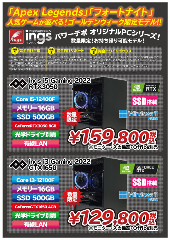すぐにお持ち帰り可能な、当店オリジナルゲーミングPC『ings』のゴールデンウィーク限定特別モデルを、2機種販売いたします!