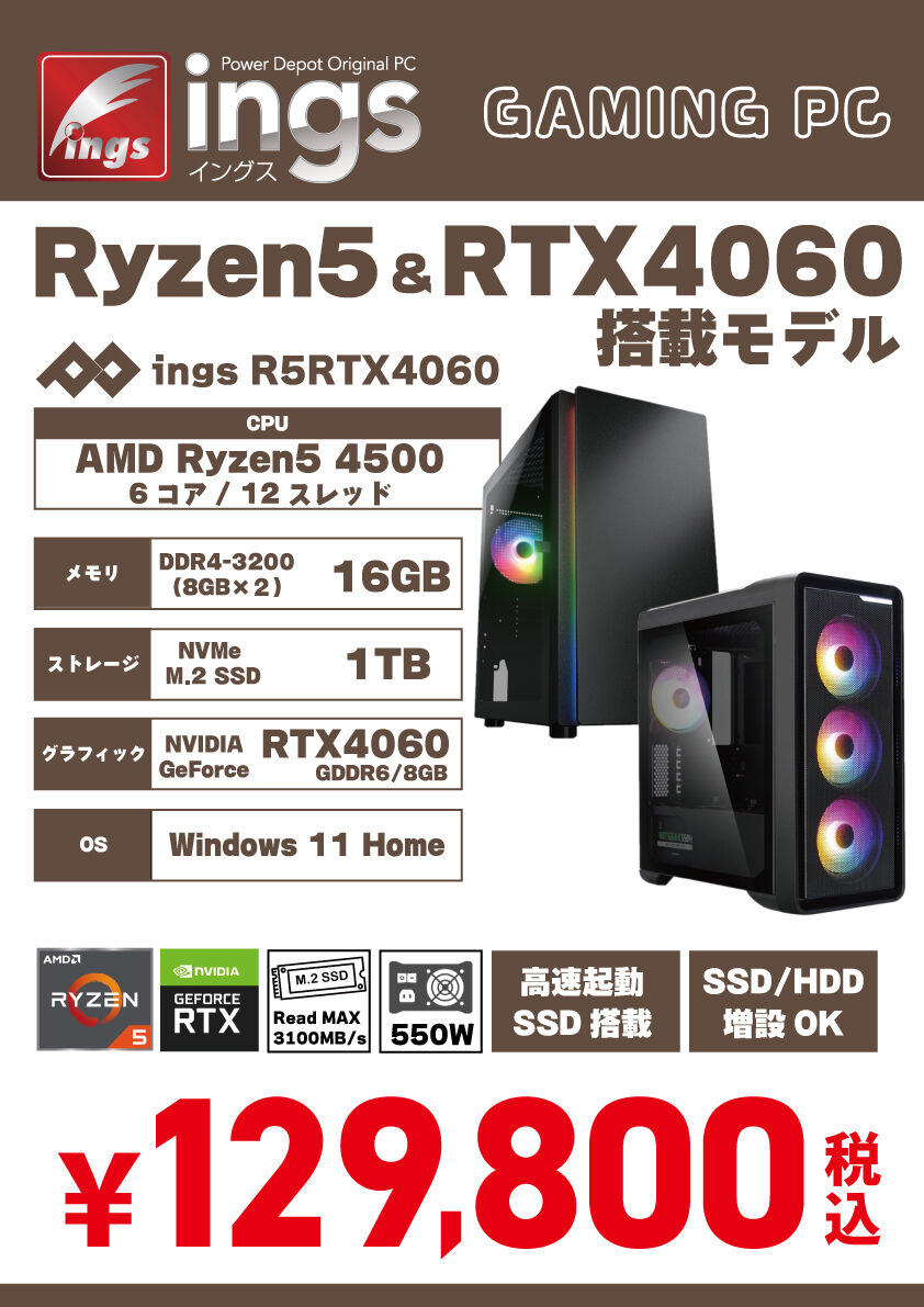 Ryzen5 4500 & RTX4060搭載のゲーミングPCが数量限定 129,800円!
