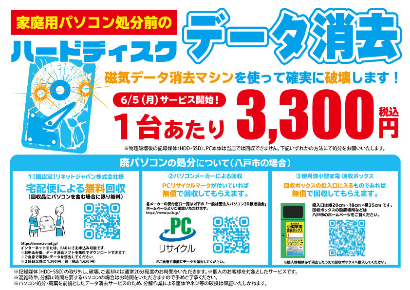 6/5より!ハードディスク消去サービス開始!